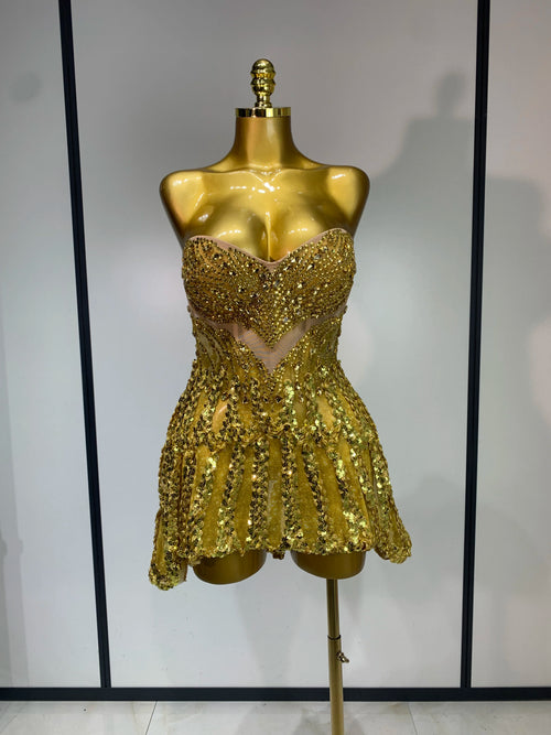 Luxury Gold Sparkly Sequins Diamonds Mini Dress Birthday Dress Women Sexy Performance Costume Singer Stage Nightclub Outfit