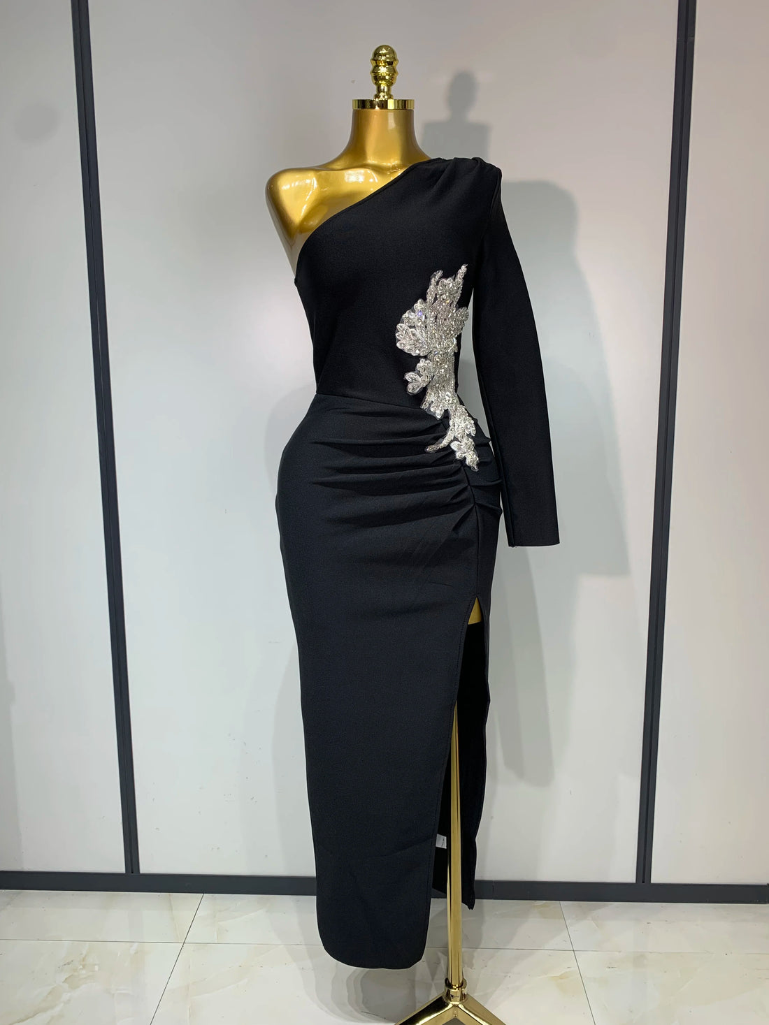 Women Sexy One Shoulder Beading Black Long Bodycon Bandage Dresses Birthday Celebrity Elegant Knitted Evening Party Dress