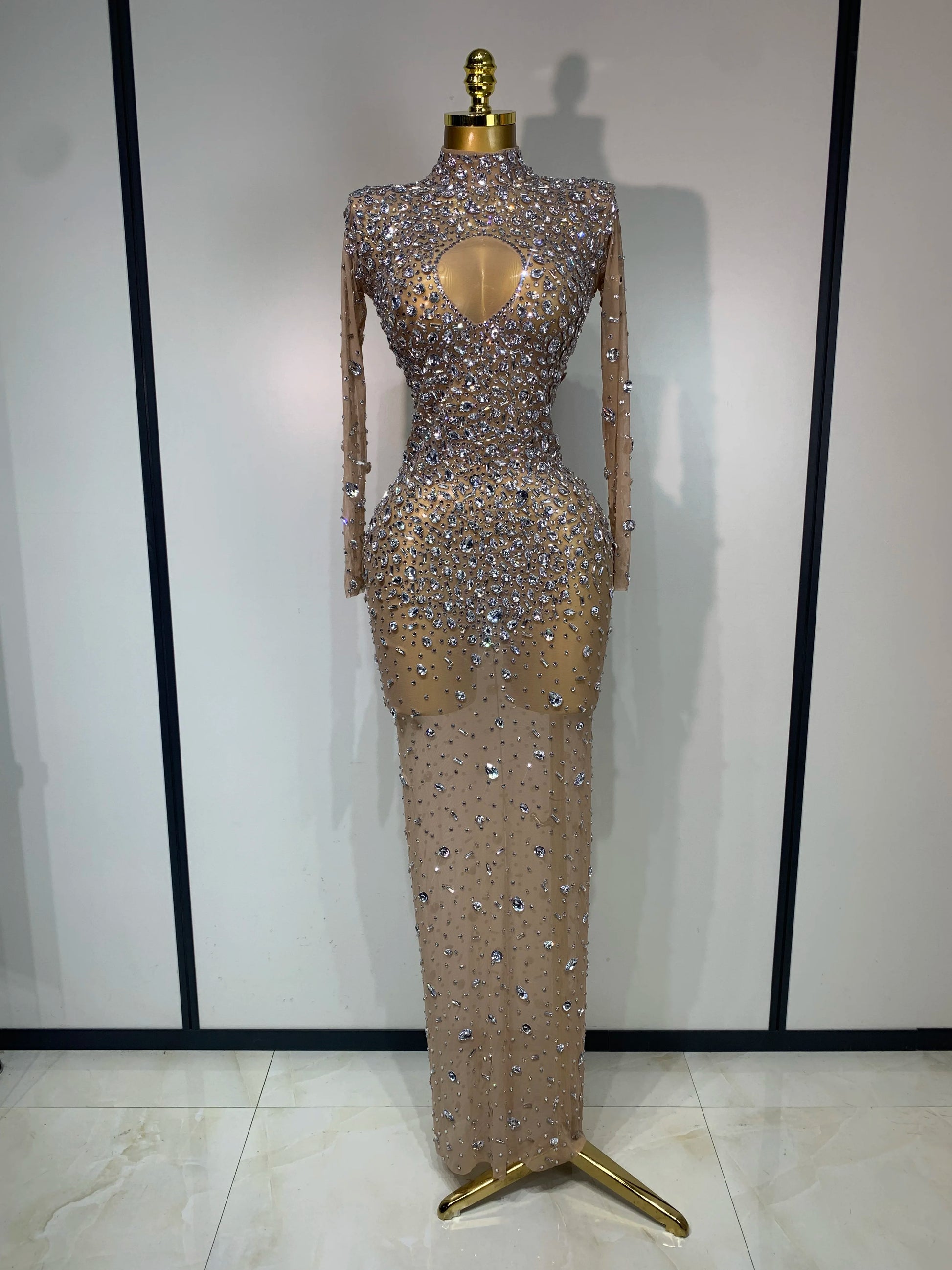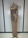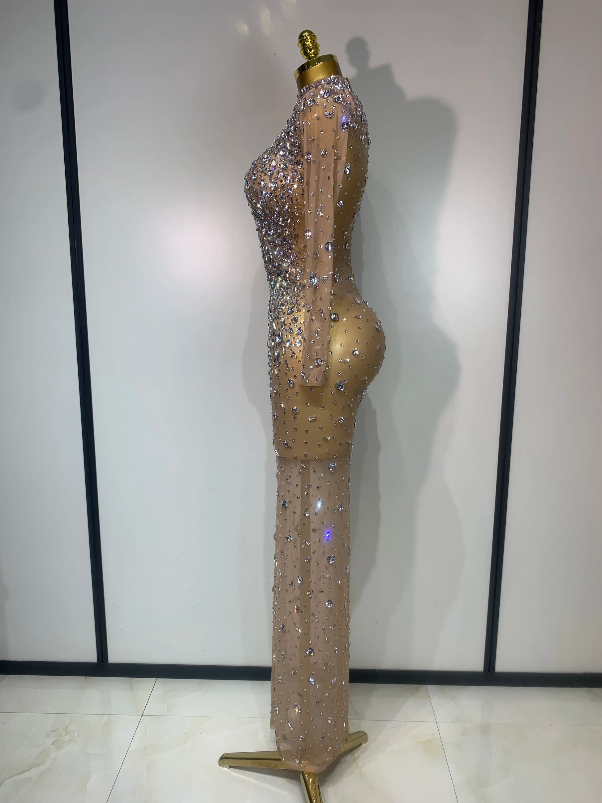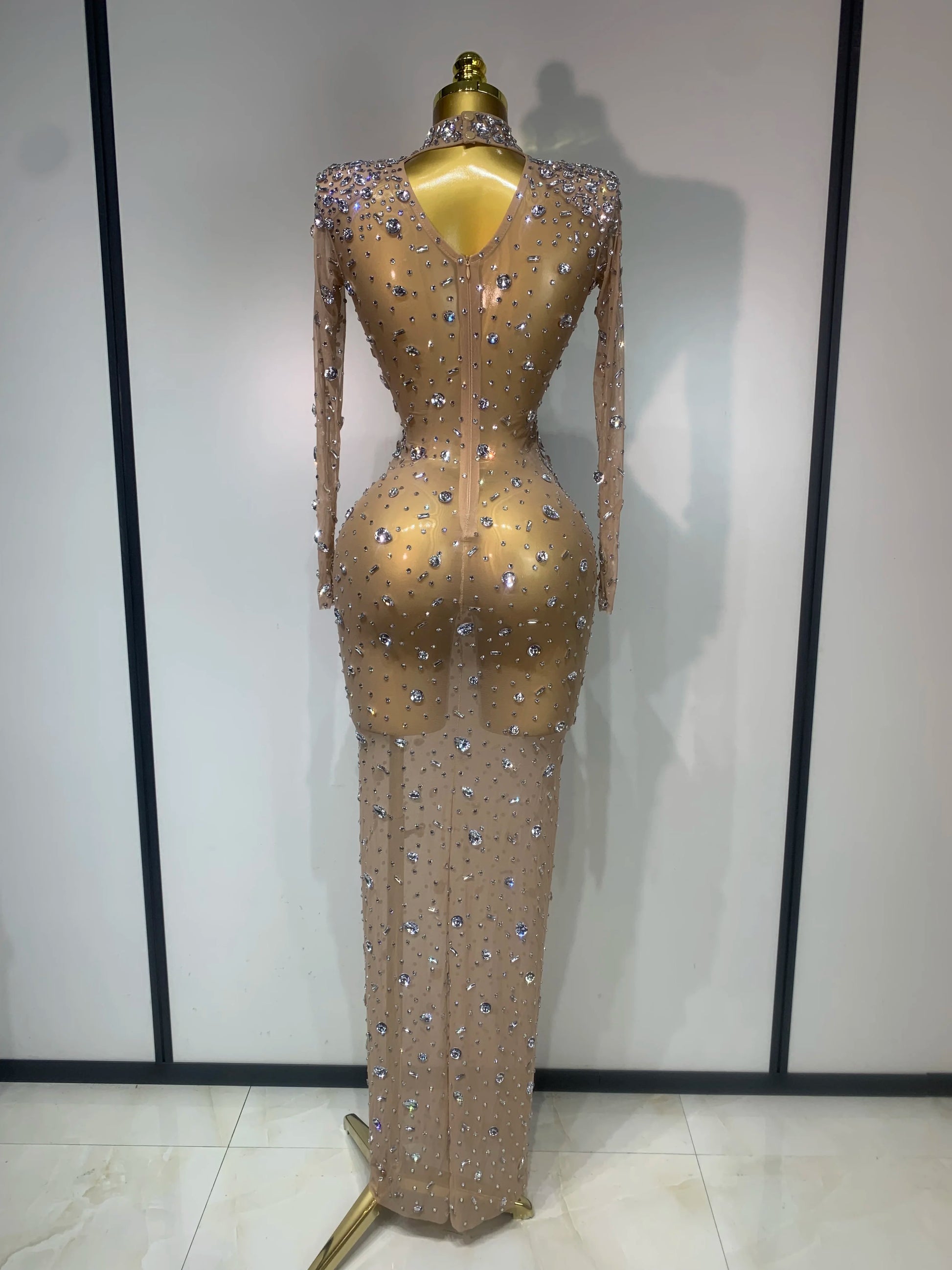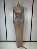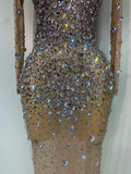 Women Sparkly Diamonds Mesh See Through Bodycon Dress Evening Birthday Party Sexy Nightclub Bar Stage Costume