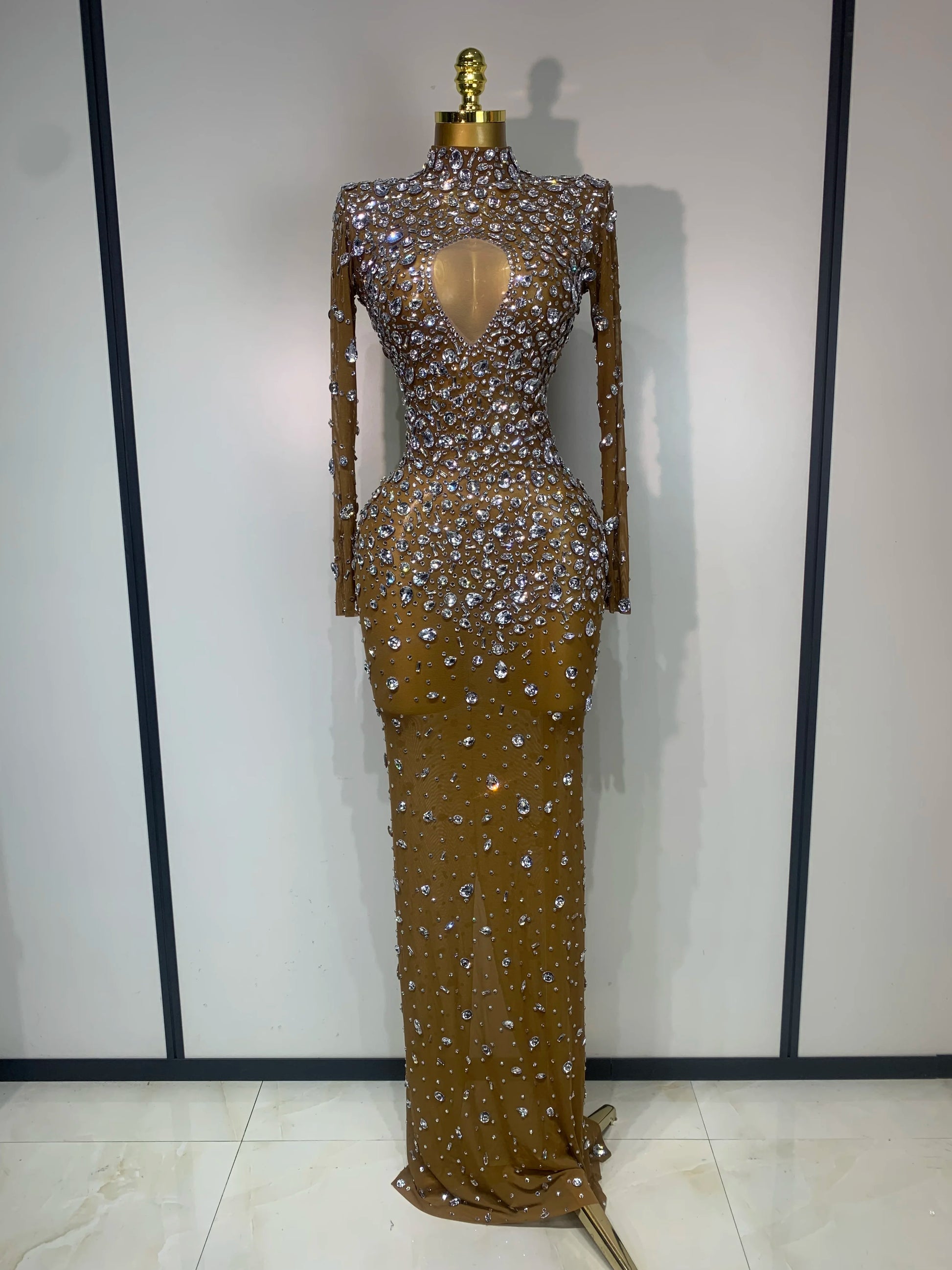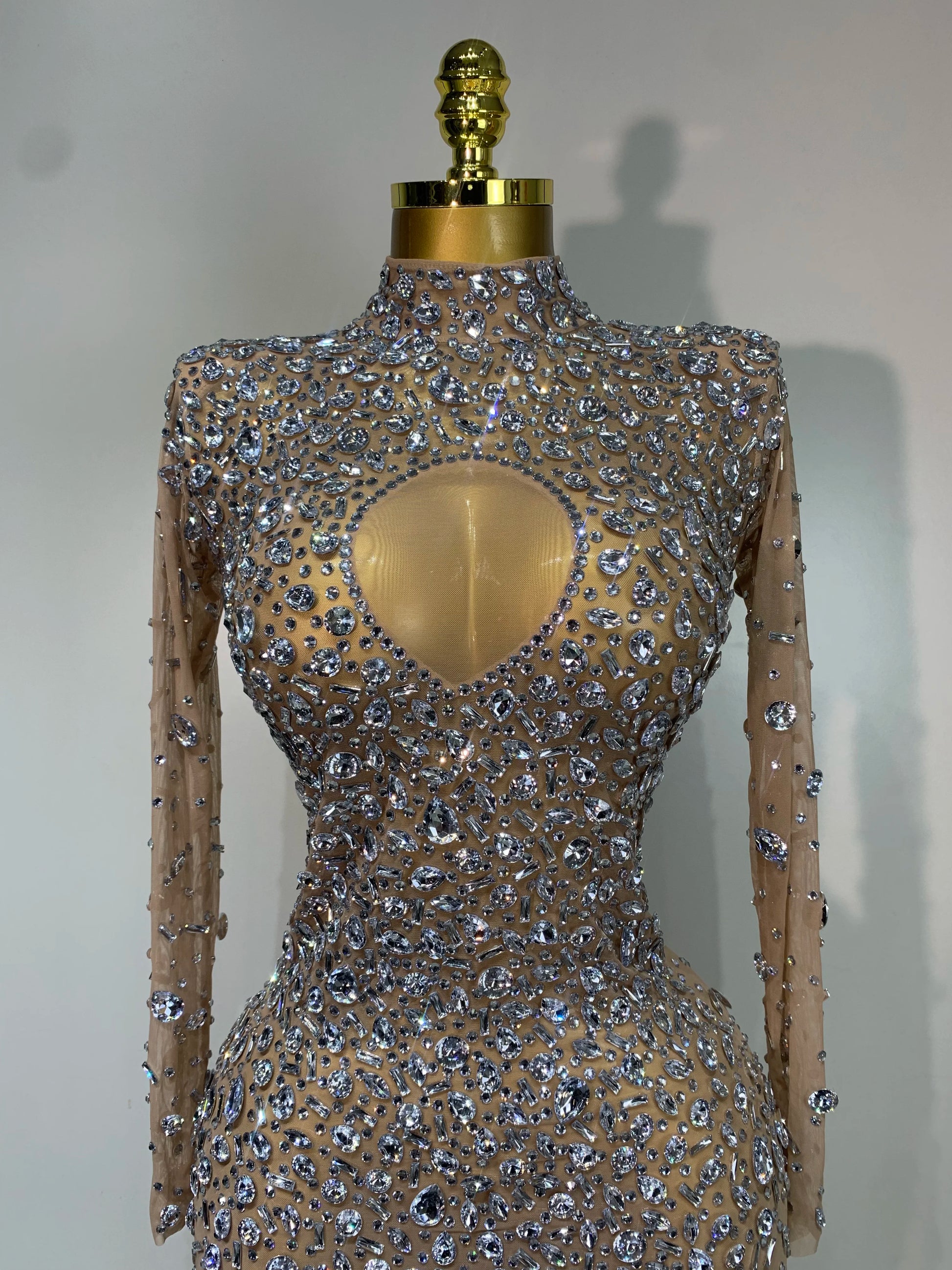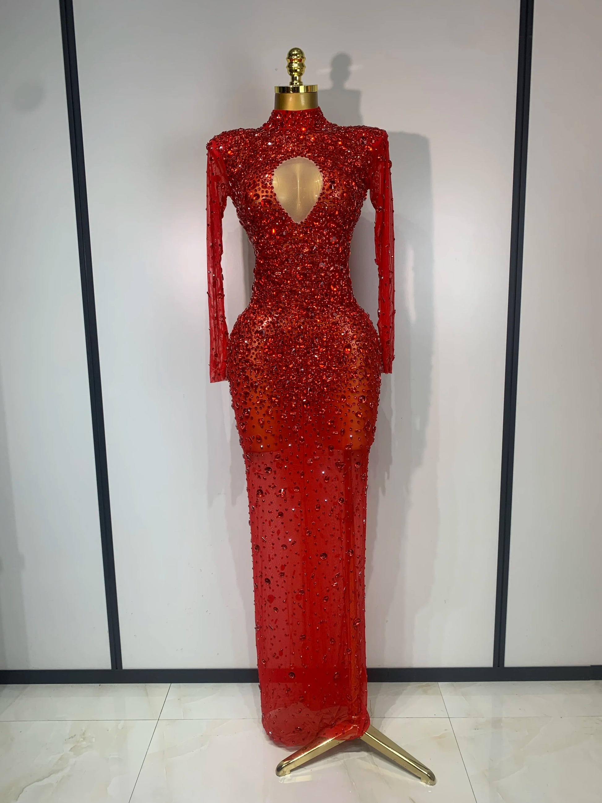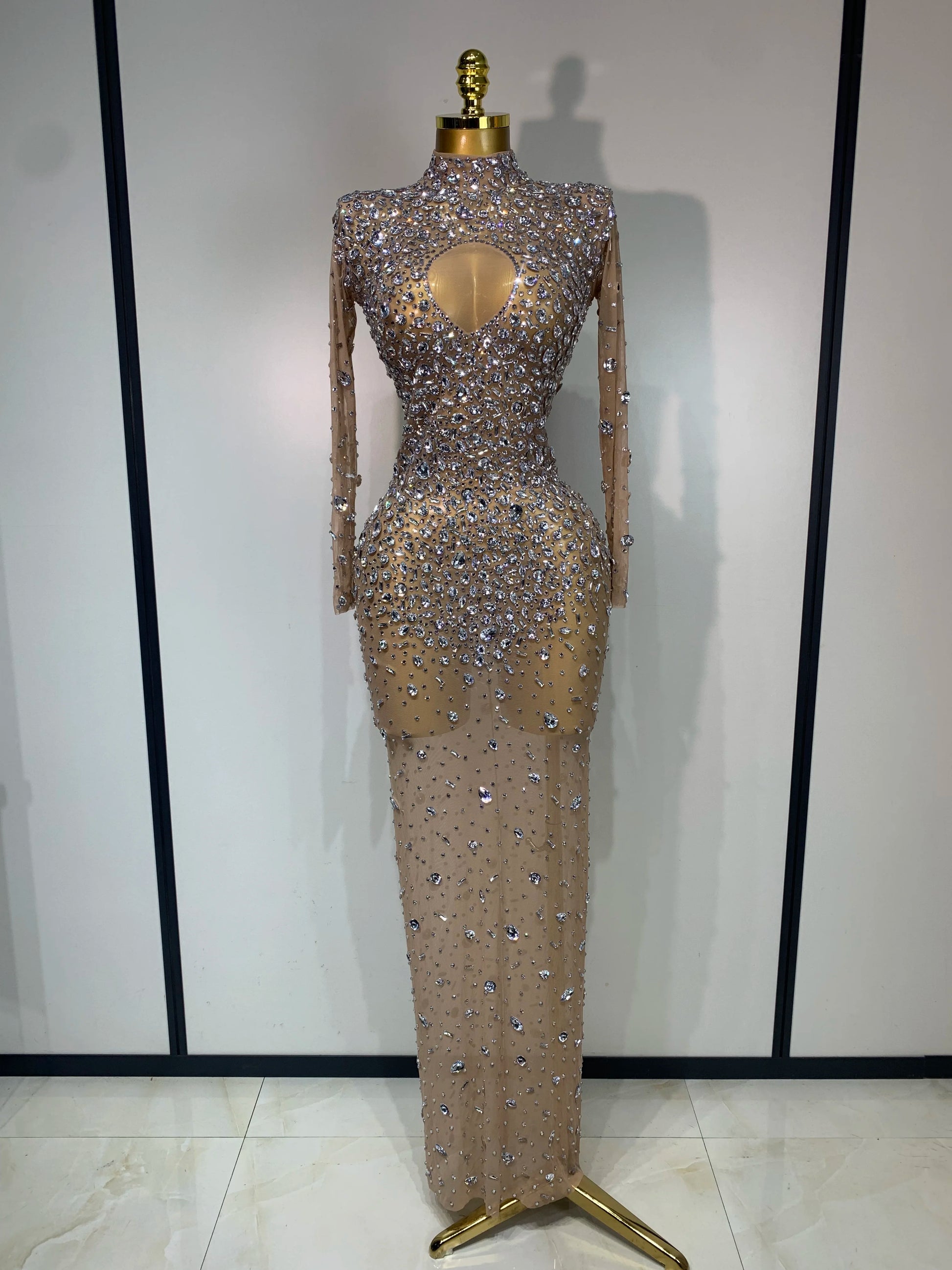 Women Sparkly Diamonds Mesh See Through Bodycon Dress Evening Birthday Party Sexy Nightclub Bar Stage Costume